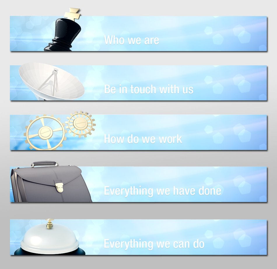 Обязательным условием выполнения задачи было сохранение единого стиля. Баннер представляет собой красочный фон в сине-бирюзово-розовых тонах. Поверх него нанесены иконы, символизирующие основные разделы, и словесные указатели на английском языке.